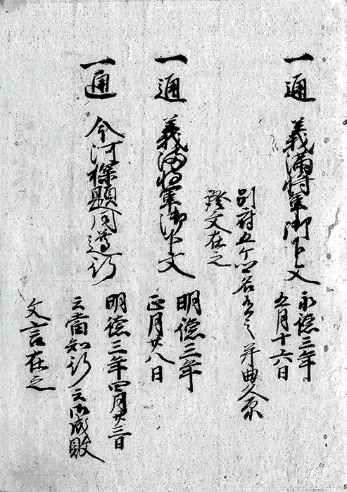 一別府文書 (ア)一通 庁宣 〈応保二年七月八日/大介中原朝臣在判〉 (イ)一通 関東施行 〈建久二年八月一日/但本木・内殿両郷文書〉 社務氏家代 盛時裏判 (ウ)一通 関東安堵 〈建永元年七月十四日/奉行五人各在判〉 同氏用代 但本木・内殿同前 (エ)一通 関東裁断下知 〈正嘉元年六月日/預所橘朝臣在判/但散在和与状云々。〉 (オ)一通 関東安堵 〈弘安二年十月廿八日/別当相模守平朝臣(北条時宗)在判〉 社務長氏代 但社務職安堵文言同有之。 (カ)一通 同施行 〈弘安二年十二月二日/奉行両人在判〉 同長氏代 (キ)一通 同守護所下知 〈弘安二年十二月廿日/関東奉行五人在判〉 同長氏代 袖判無名 (ク)一通 決断所御牒 〈建武元年三月廿日/西市正中原朝臣(章有)在判/右中弁藤原朝臣(中御門宣明)在判〉 (ケ)一通 (足利)義詮御下文 〈正平六年十二月三日〉 社務氏正代 〈肥前国杵島北郷須古庄/地頭職文言在之。〉 (コ)一通 九州探題一色道猷(範氏)遵行 〈観応元年十一月廿五日〉 五ケ所勲功之賞文言在之。 (サ)一通 (足利)義詮御下文一色宮内少輔(直氏)殿御教書 社務氏正代 〈文和元年十一月廿二日/但須古庄文言有之。〉 (シ)一通 義詮御下文 〈貞治二年五月二日〉 同氏俊代 但須古庄文言有之。 (ス)一通 今河探題了俊(貞世)証状 〈応安六年/七月廿九日〉 同氏俊代 武藤豊前孫次郎 武藤豊前守両人尋状 (セ)一通 今河探題(了俊)使節原田少輔三郎(種公)〈仁〉宛社家へ渡状 〈応安六年九月廿八日〉 同氏俊代 (ソ)一通 使節原田大蔵種公請文 〈応安七年/二月十六日〉 同氏俊代 曲村証文在之。 (タ)一通 了俊(今川貞世)原田方〈エ〉重御教書 〈応安六年/十二月廿六日〉 同氏俊代 曲村証文有之。 (チ)一通 使節原田請文 〈応安七年二月十六日〉 同氏頼代 曲村証文有之。 (ツ)一通 (足利)義満将軍御下文 〈永徳三年/五月十六日〉 別府五ケ郷名有之。并曲・久原証文在之。 (テ)一通 義満将軍御下文 〈明徳三年/正月廿八日〉 (ト)一通 今河探題(了俊)同遵行 〈明徳三年四月廿三日/云当知行云御成敗文言在之。〉 已上一巻二十通 (ナ)一通 今河(了俊)殿御状 〈五月十日〉 社務氏頼代 (ニ)一通 今河金吾(仲秋)書状 但探題了俊〈エ〉口入肝要状也。五月一日 氏頼代 但了俊舎弟実名仲秋〈ト〉申之。 以上一巻二通 |
