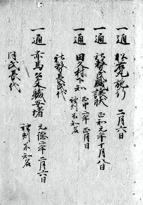 一赤馬庄久吉・刀禰丸文書 一通 田久村安堵状 〈建長七年十月日/袖判不知名字。〉 社務氏業代 一通 女院御返事仮名書消息 〈十二月十一日〉 一通 権中納言顕朝消息 〈康元元年/十一月廿二日〉 一通 弾正少弼消息 〈康元元年十一月廿二日/無判〉 一通 関東下知 〈正嘉元年閏三月廿日/武蔵守・陸奥守両判〉 社務氏業代 一通 姉小路中納言消息 〈正嘉元年/十一月十四日〉 同氏業代 一通 田久村久吉・刀祢丸・久富・今吉安堵状 同氏業代 〈文永二年六月八日/袖判〉 一通 田久村安堵状 〈弘安六年二月三日/袖判不知名。〉 社務長氏代 一通 庁宣 〈弘安十年二月日〉 氏富 一通 田久村下知 〈嘉元元年九月日〉 社務氏盛代 一通 消息 〈不知名、/但領家歟。〉 〈嘉元元年十月一日〉 一通 松若丸施行 〈二月六日〉 一通 社務氏盛譲状 〈正和元年十月八日〉 一通 田久村下知 〈正中二年正月日/袖判不知名。〉 社務長氏代 一通 赤馬公文職安堵 〈元徳二年二月六日/袖判不知名。〉 同氏長代 一通 惟宗氏女賜安堵 〈元弘二年/二月三日/法橋隆恵判〉 一通 惟宗氏女賜安堵 〈元弘二年二月日/袖判不知名。〉 一通 田久補任 〈元弘三年八月日/公文職文言有之。〉 一通 庄主預状 〈永和元年十月日〉 一通 今河了俊安堵状 〈至徳二年十月五日〉 一通 源宗貞怙〔沽〕券状 〈明徳二年二月日〉 仲元寺歟、 已上一巻二十一通 |