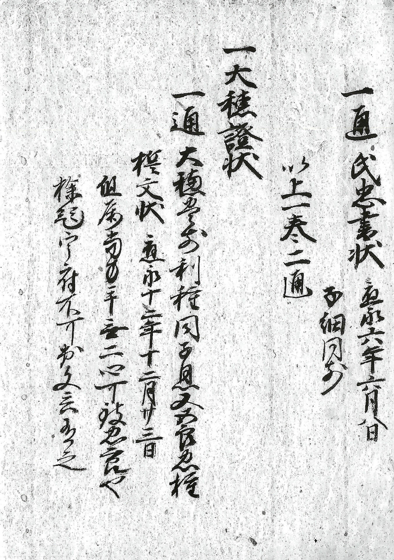 一大穂証状 一通 大穂豊前利種・同子息又五郎忠種誓文状 〈応永十二年十二月廿三日〉 但属当方手無二心可致忠節也。 探題宰府不可出文言有之。 一通 大穂豊前誓文状 〈応永十五年/八月二日〉 但不可有野心事也。 已上一巻二通 |