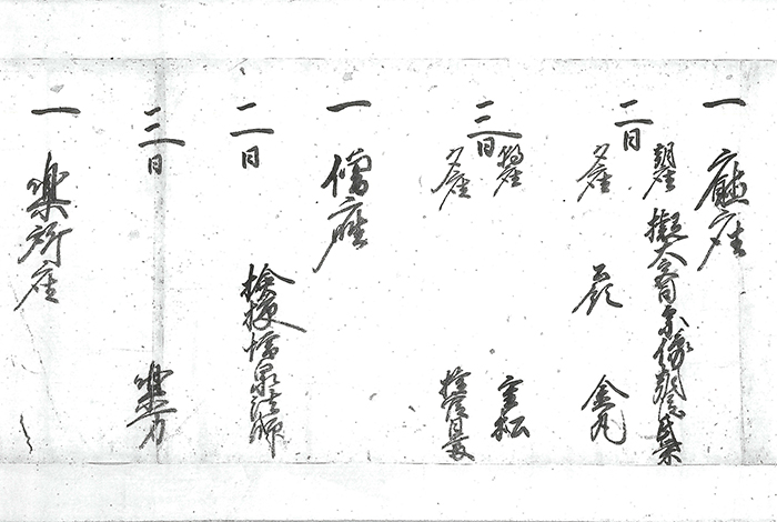 差定 明年〈丙戊〔戌〕〉孔大寺会座々頭番事 一朔日 庄司勤 一二日 神官勤 一三日 権官勤 一 庁座 二日〈朝座 権擬大宮司宗像朝臣氏栄/夕座 公領 金丸〉 三日〈朝座 重松/夕座 権官日当〉 一 僧座 二日 検校増泉法師 三日 楽万 一 楽所座 二日 公領 三日 公領 一 貫首座 二日 公領 三日 公領 一 祢宜座 二日 四郎兵衛 三日 公領 一 預座 二日 四郎衛門 三日 公領 右座々頭番如件、 天正十三年〈乙酉〉二月四日 大行事 正三位大明神 |