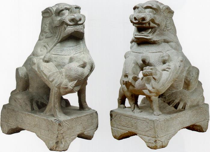 子獅子を抱く阿形、玉を持つ吽形の狛犬一対で、各々一塊の石灰岩から台座ごと掘り出された美しい作品である。彫刻技術や唐獅子の形状から南宋からの渡来品と考えられ、鎌倉時代前期の宗像大宮司家の南宋との交流を示す資料のひとつである。阿形、吽形ともに背中に「奉施入宗像宮第三御前宝前、建仁元年辛酉藤原支房」という銘が彫り込まれていて、建仁元年(1201)に宗像大社第三宮に奉納されたことがわかる。奉納者についての関連史料がなく詳細は不明であるが、宗像大社に所縁のある人物であることは疑いなく、大宮司家一族あるいは宗像に地縁のある人物で、南宋交易に関わっていた大宰府政庁の役人であったかもしれない。 |