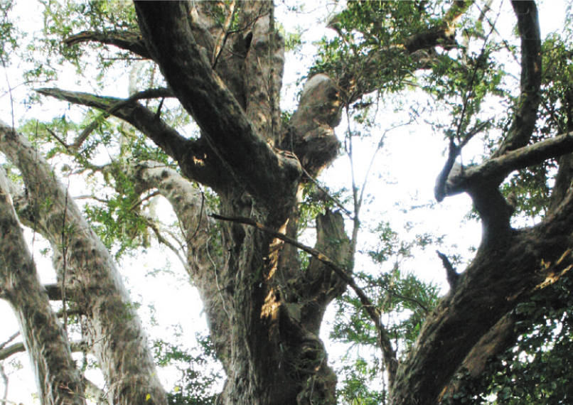 吉武のマキは、樹齢は七百年から九百年と推定されるイヌマキの巨木です。個人宅のマタケ林の中にあることから、畑の防風林として植えられたのではないかと推測されています。樹高二十一m、幹周り四・二m。胸高直径は一・五m近くもあり、大木でも三十から六十とされるイヌマキの中では、全国でも稀に見る巨樹として知られています。幹は地上二m付近で五本に分岐しており、空を覆うように枝を広げた姿は素晴らしく、たいへん趣があります。 |