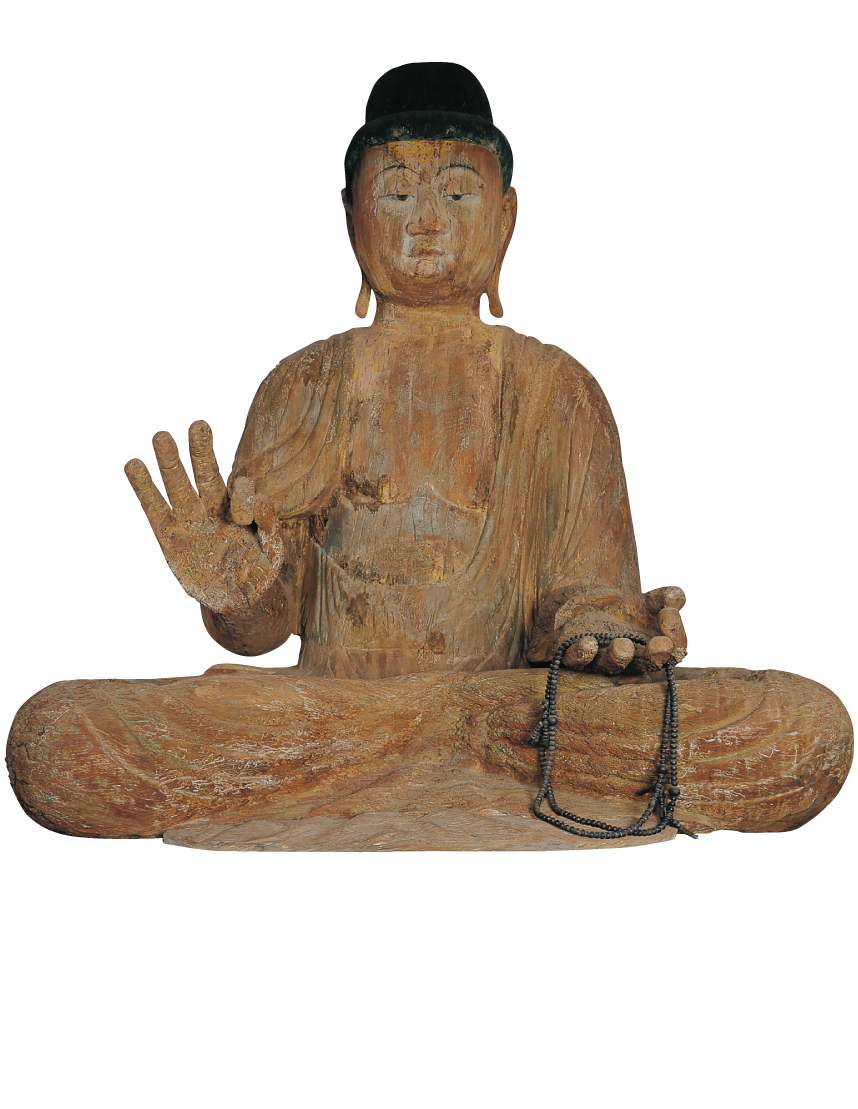 明治五〜十三年にかけて編集された『福岡県地理全誌』に「小堂三所、阿弥陀堂、堂の上にあり、坐像長五尺。古仏なり」と記された像です。高さ百二十八・五cm、楠材の一木から頭と体を彫り出す一木造で、膝の部分には別の材が用いられています。 風化が進んでいたために行われた平成三年(一九九一)の保存修理の際、膝前の材に天正十二年(一五八四)の修理銘が墨書きされていることが分かりました。これによると、宗像郡河西郷の用山村の人たちが、天下泰平、国土安穏、村々の諸災消除、福寿増長などを祈って、無量寿(阿弥陀如来)を再興したことが記されています。また、この仏像再興事業は、藤原某氏が博多冷泉津あたりの仏師を使い、念仏講で結ばれた用山の人々の合力(資金協力)によって行われたことも記録されています。 本像は、平山の阿弥陀如来立像と同じ「上品下生」の印(いわゆる来迎印)を結んでおり、人々が臨終に際して極楽往生を願い、阿弥陀の救済によって極楽浄土に迎えられることを願ったことがうかがえます。 |