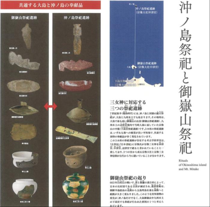 沖ノ島祭祀と御嶽山祭祀 三女神に対応する三つの祭祀遺跡 7世紀後半(飛鳥時代)には、沖ノ島と同様の露天祭祀が、大島と九州本土でも始まります。その場所は、大島で最も高い御嶽山の山頂(御嶽山祭祀遺跡)、九州本土の辺津宮境内で当時入海に面していた宗像山の中腹(下高宮祭祀遺跡)です。3カ所の祭祀遺跡は、いずれも海への眺望が良い平坦地で、共通する独特の奉献品が多く発見されています。 この3ヵ所の祭祀遺跡が存在する考古学的事実は、「古事記」「日本書紀」に宗像氏が宗像三女神を沖津宮、中津宮、辺津宮で祀ると書かれていることと一致しており、3つの宮から成る宗像大社と宗像三女神信仰が古代から今に続いていることが分かります。